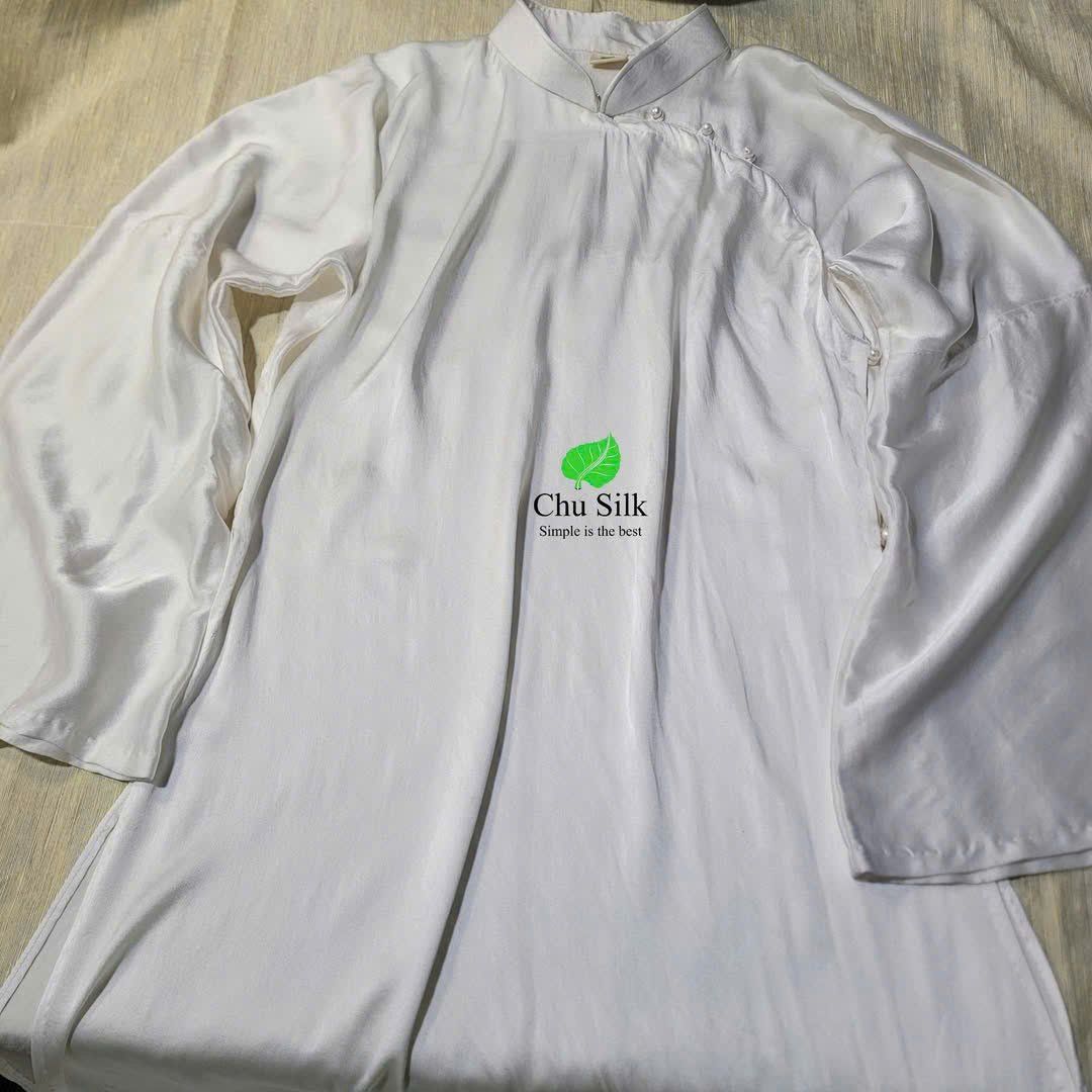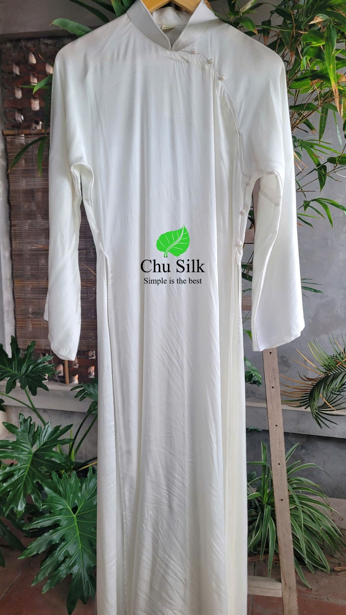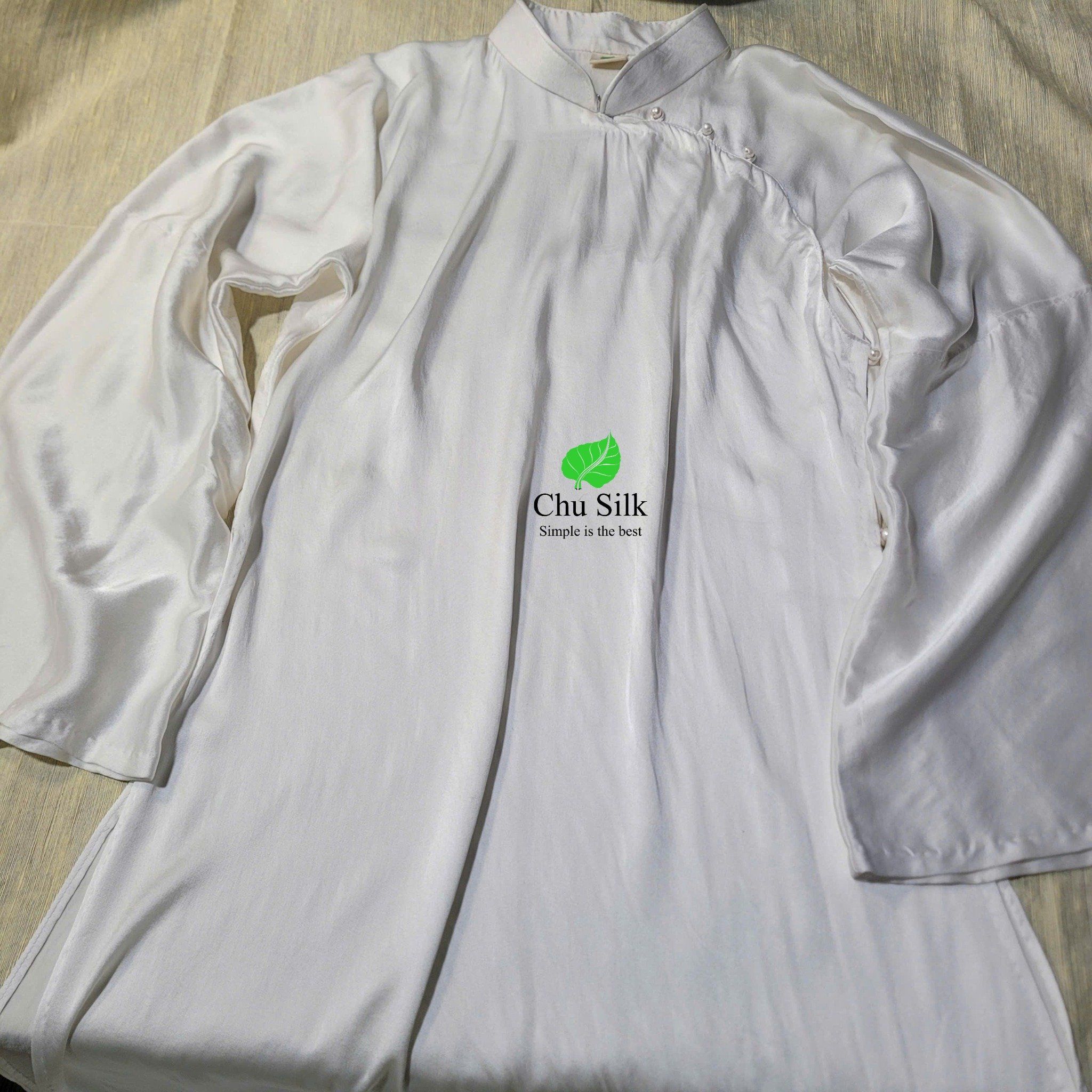 Áo dài tơ tằm thuần Việt dáng xưa màu trắng mộc của tơ 19momme cao cấp