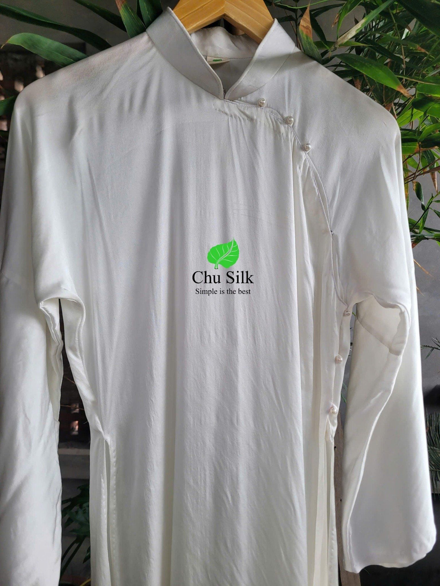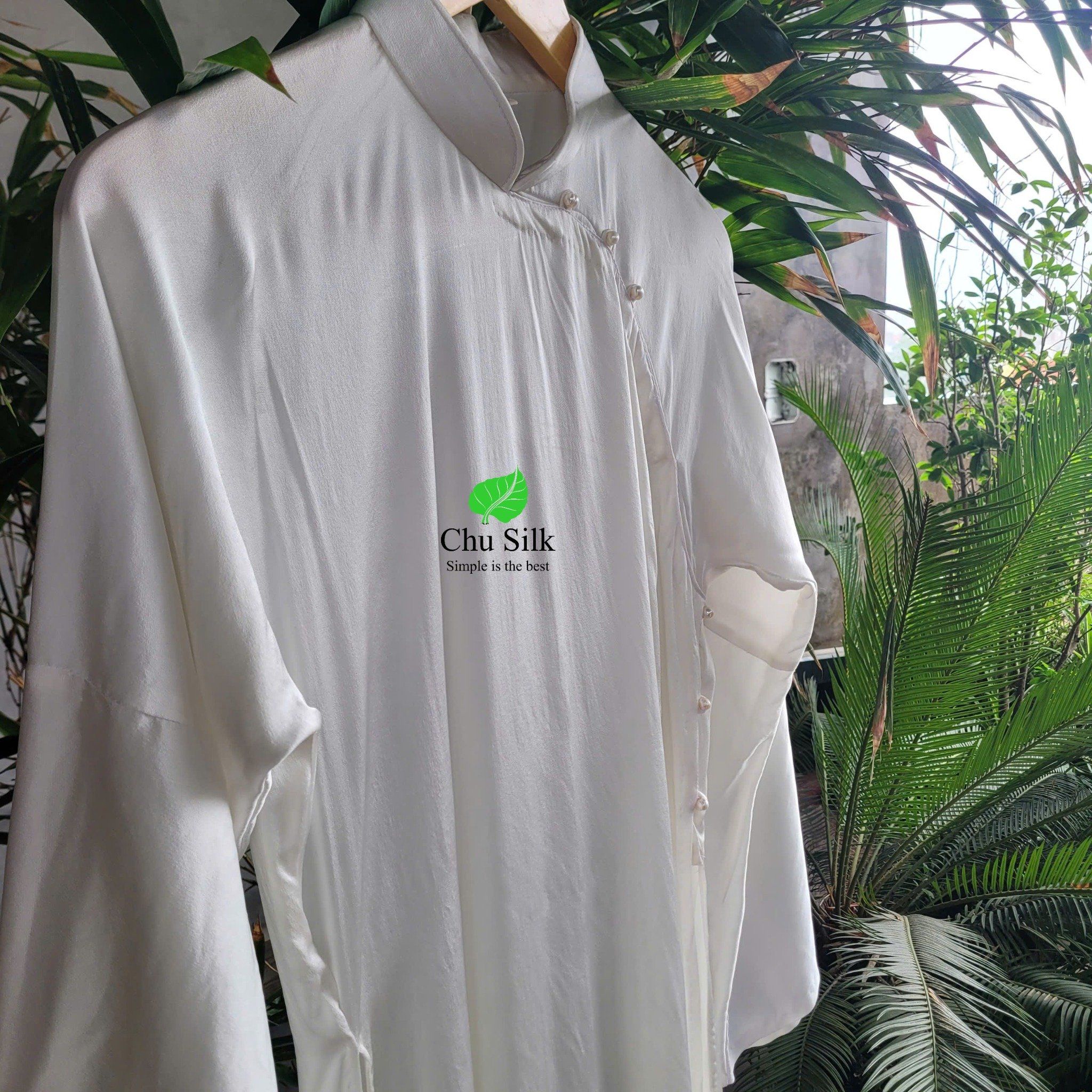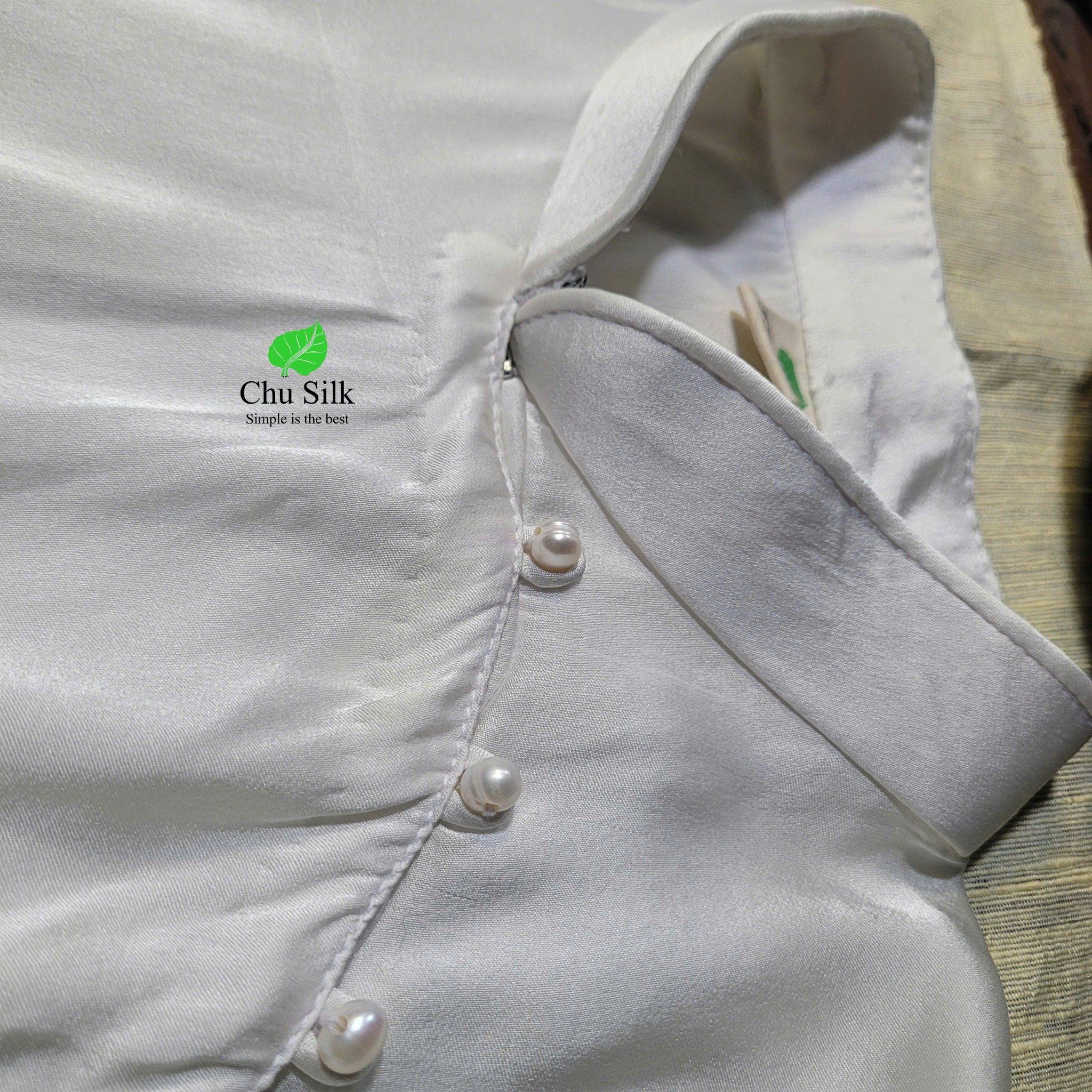 Áo dài tơ tằm thuần Việt dáng xưa màu trắng mộc của tơ 19momme cao cấp
