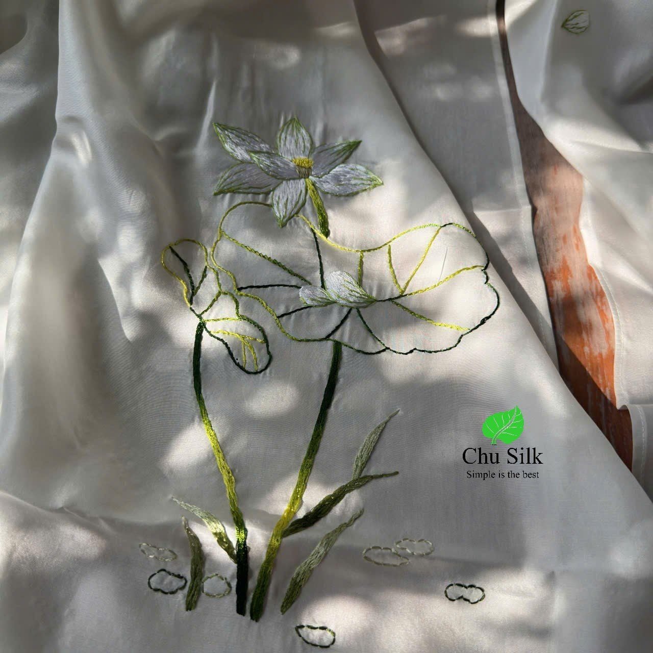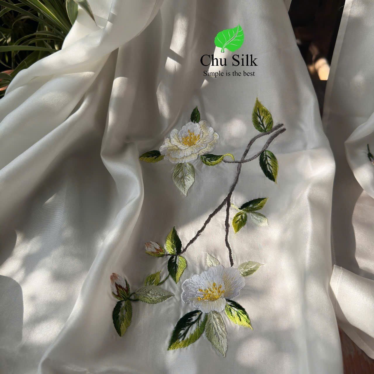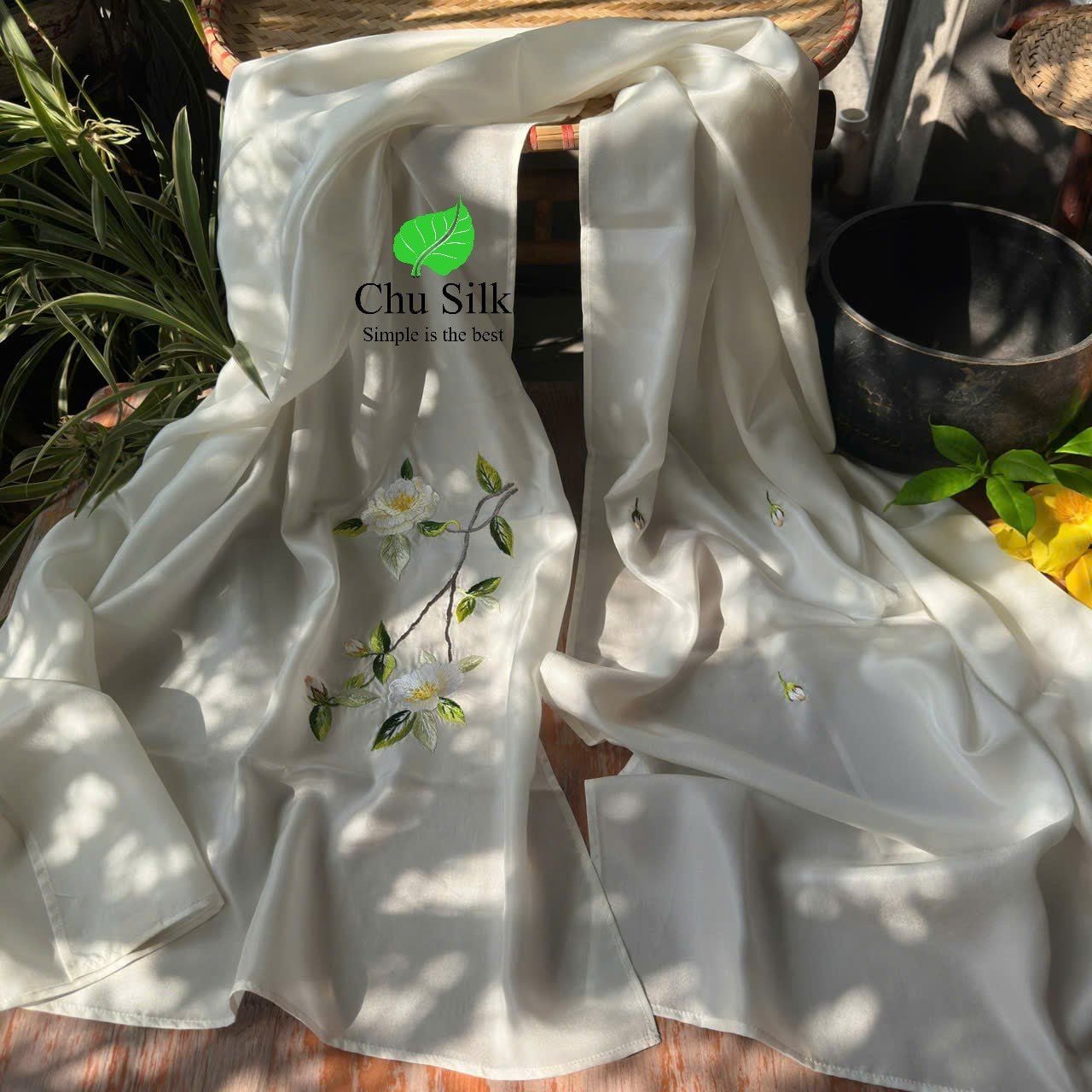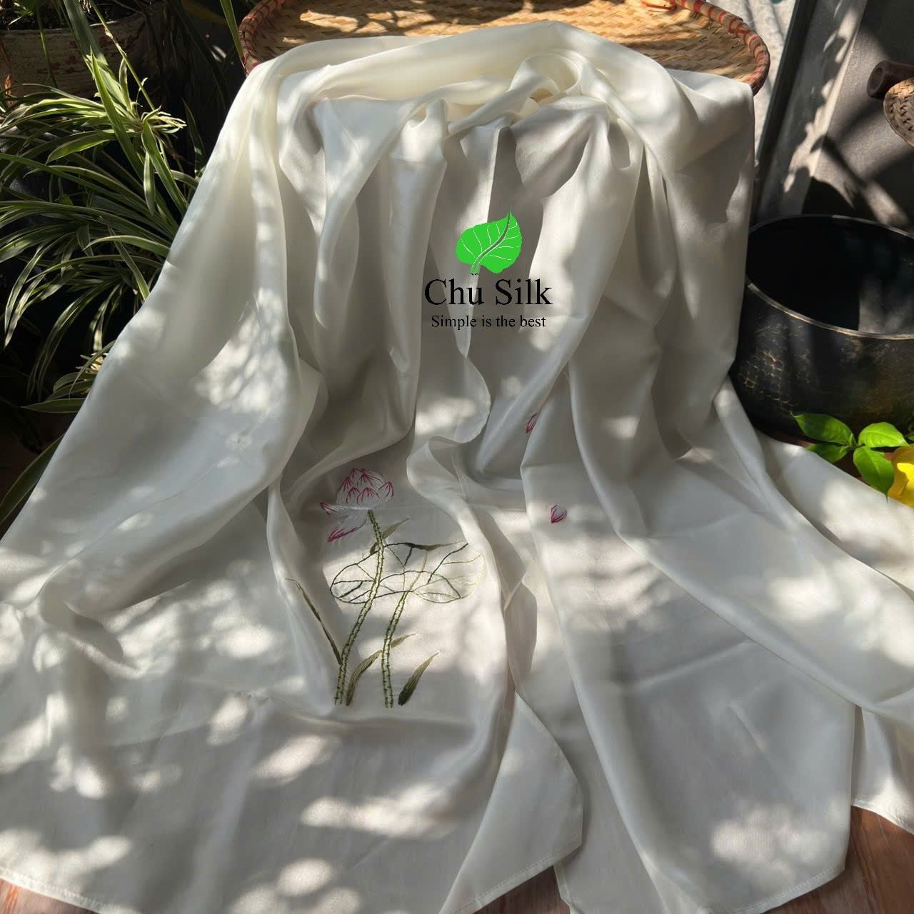 KHĂN CHOÀNG LỤA TƠ TẰM THÊU TAY MẪU MÀU TRẮNG