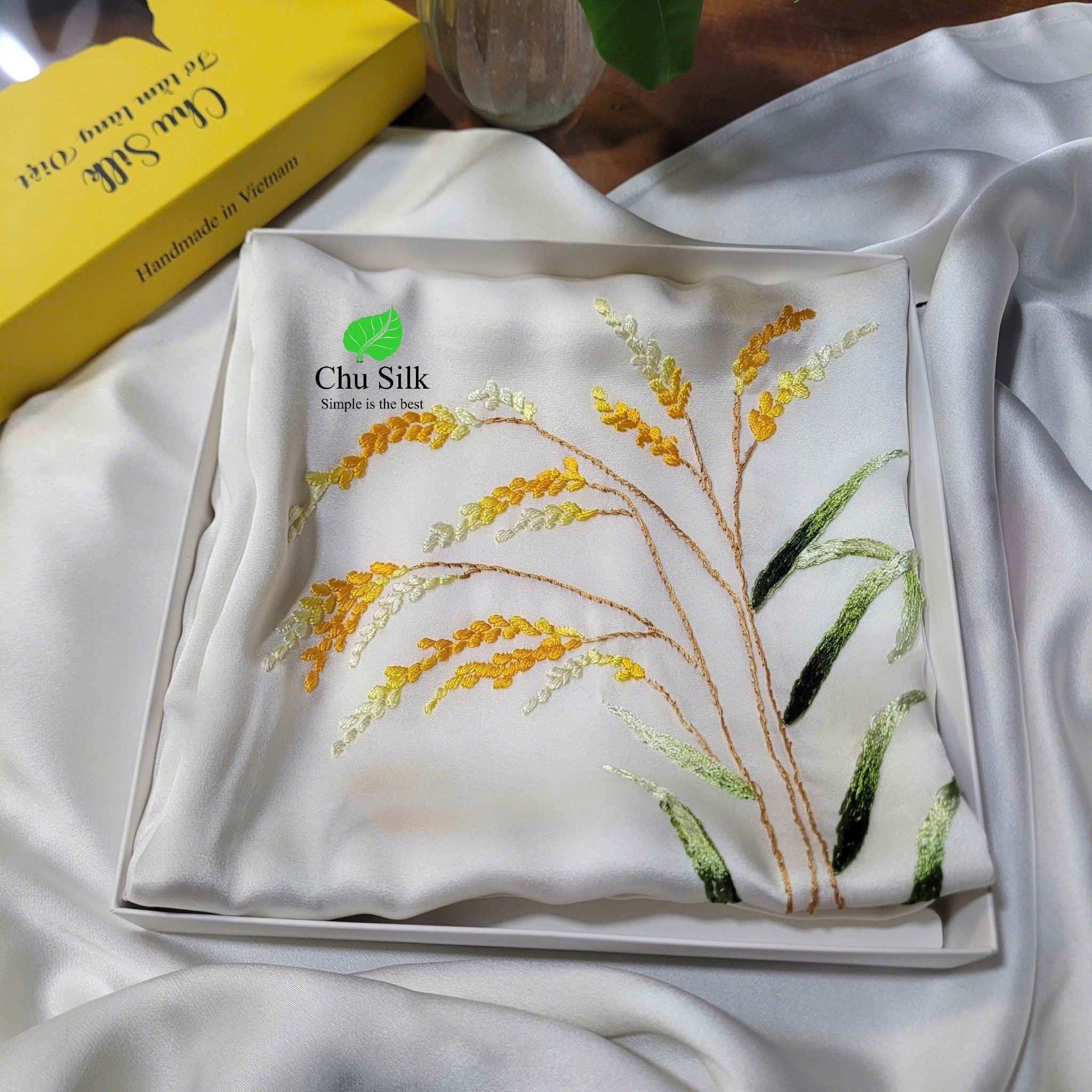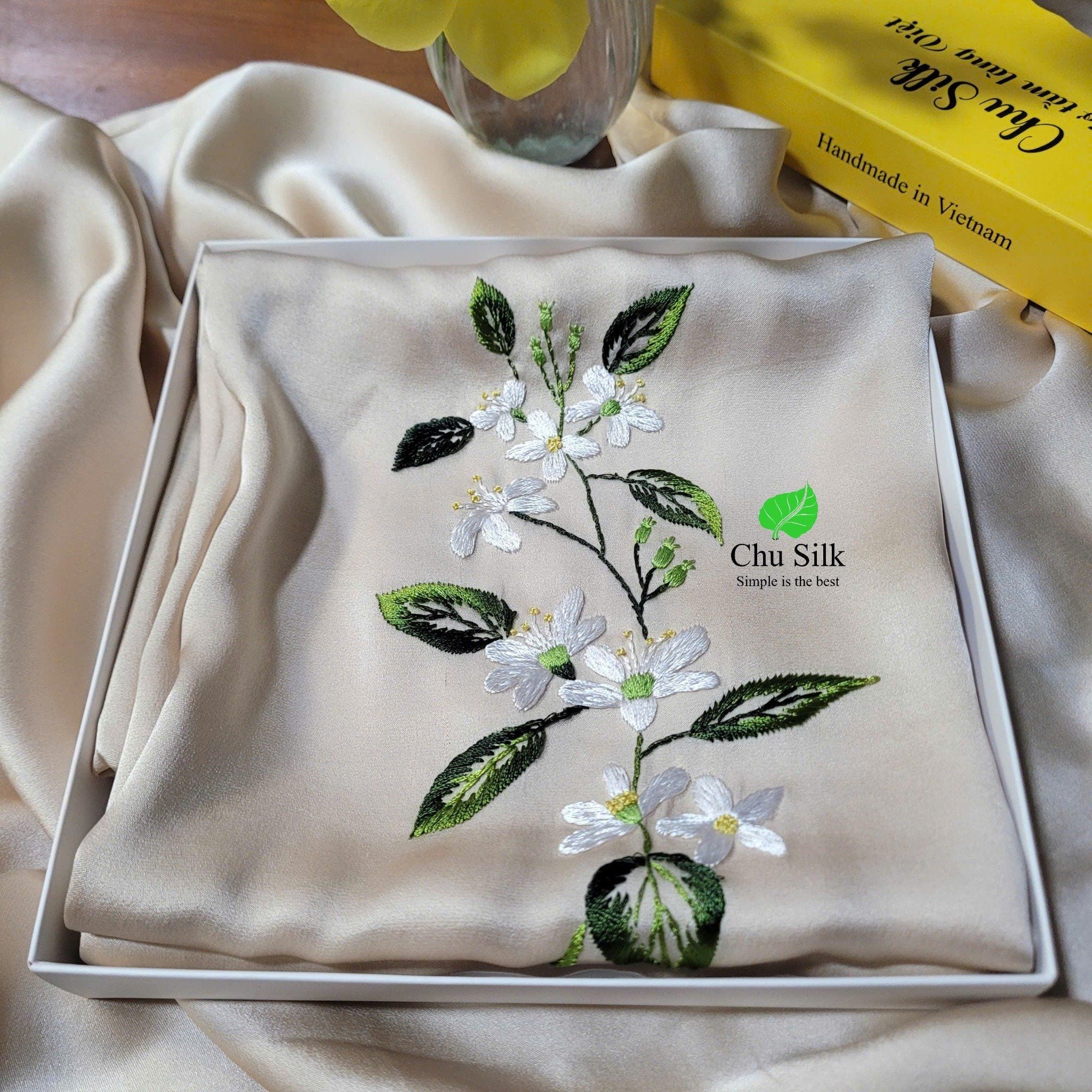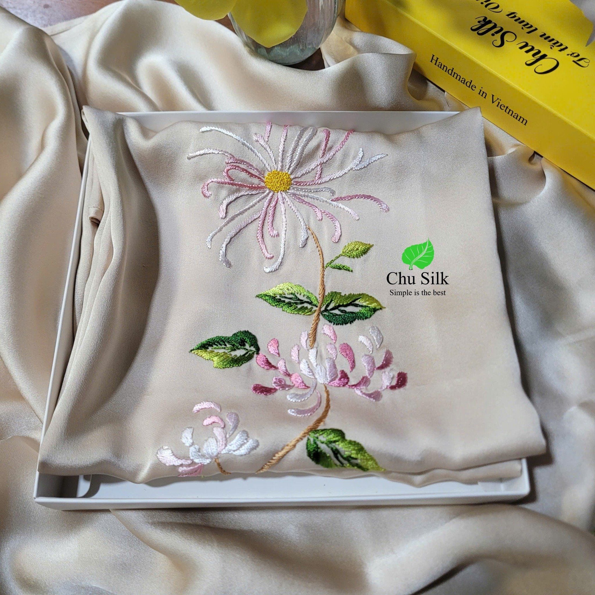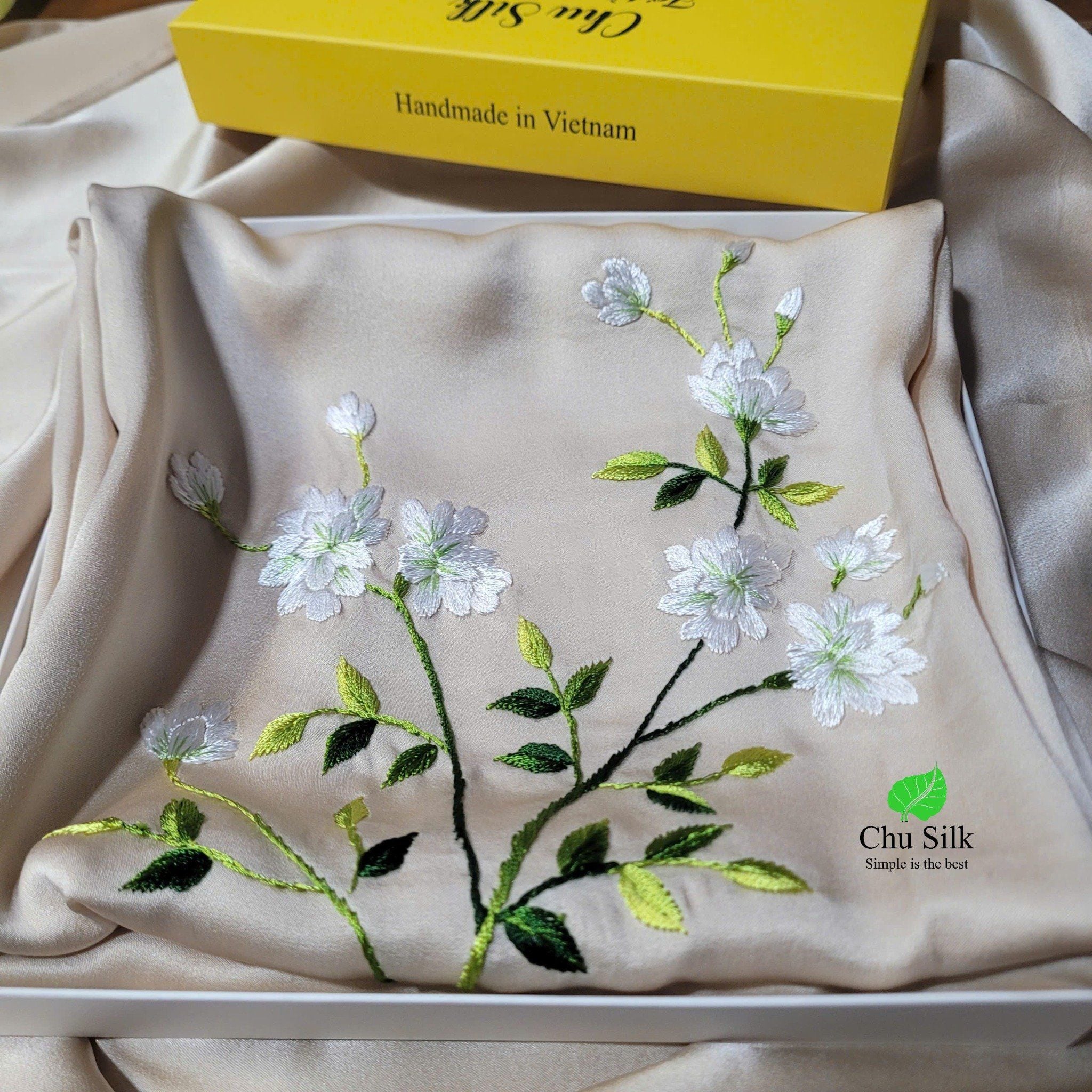 Những chiếc khăn thêu tay tinh xảo được thực hiện bởi nghệ nhân Hà Nội và nó xứng đáng là món quà ngoại giao cao cấp cho đối tác, quà hiếu thảo cho cha mẹ, quà biết ơn thầy cô, quà ý nghĩa cho bạn bè, người thương, quà thân thiện cho đồng nghiệp, hay món quà đặc biệt tự thưởng cho chính bản thân mình. Khăn được thêu chất liệu tơ tằm có độ óng ả cao.