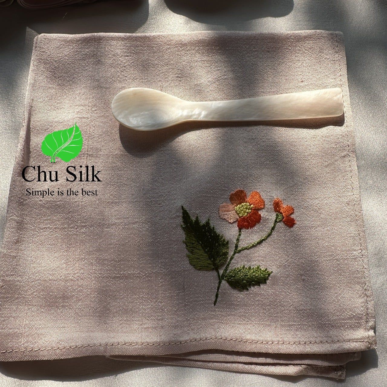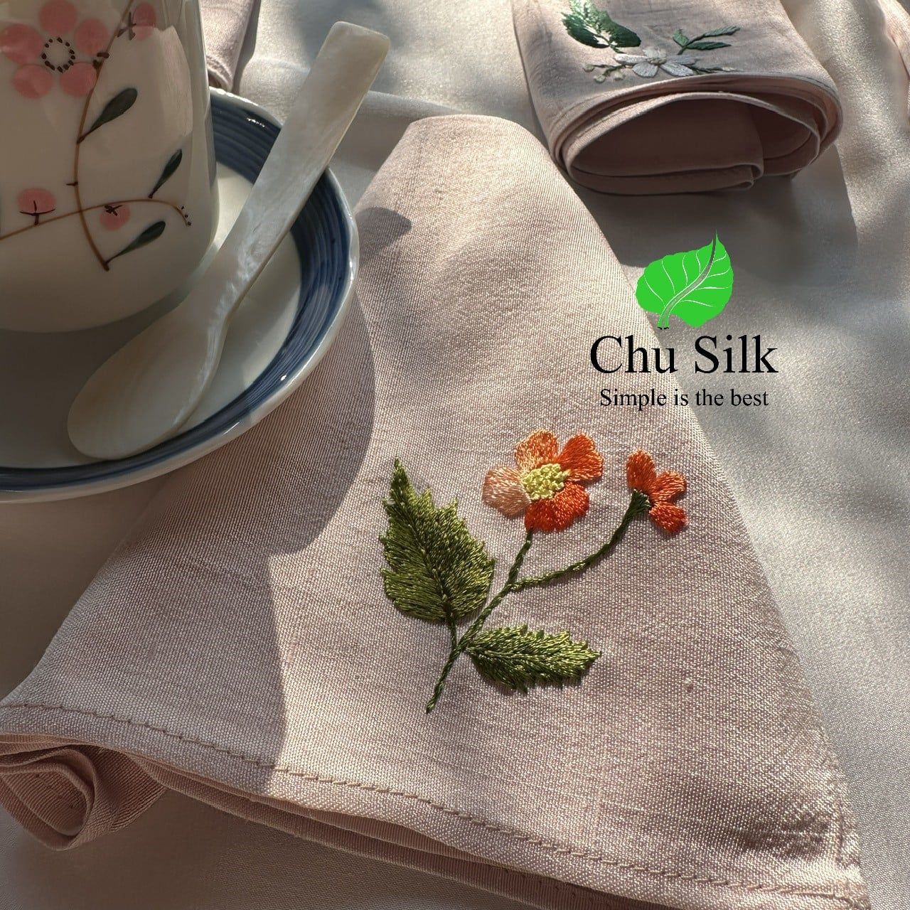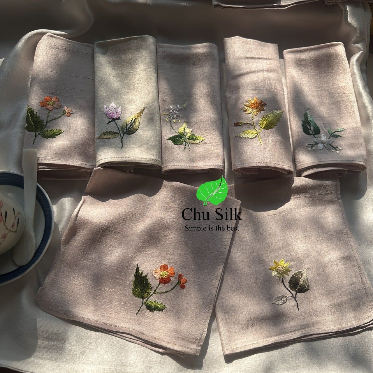 Khăn ăn lụa thêu tay họa tiết hoa, khăn ăn lụa họa tiết hoa dại, khăn ăn cá nhân hóa, trang trí bàn ăn, khăn ăn tái sử dụng, khăn ăn họa tiết bó hoa