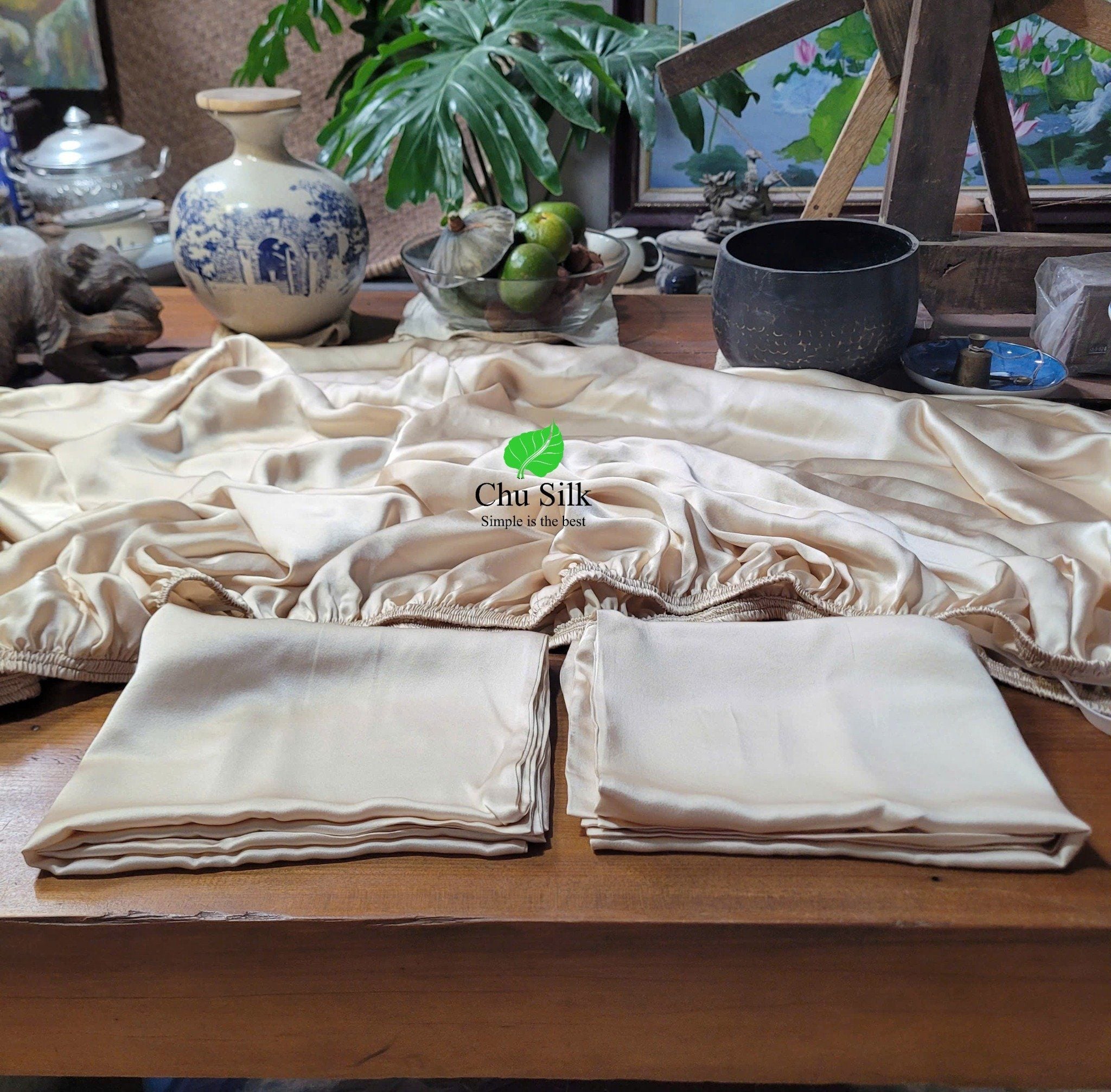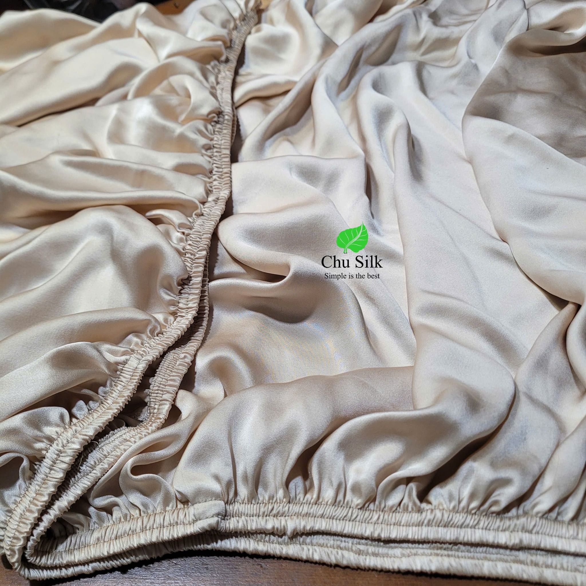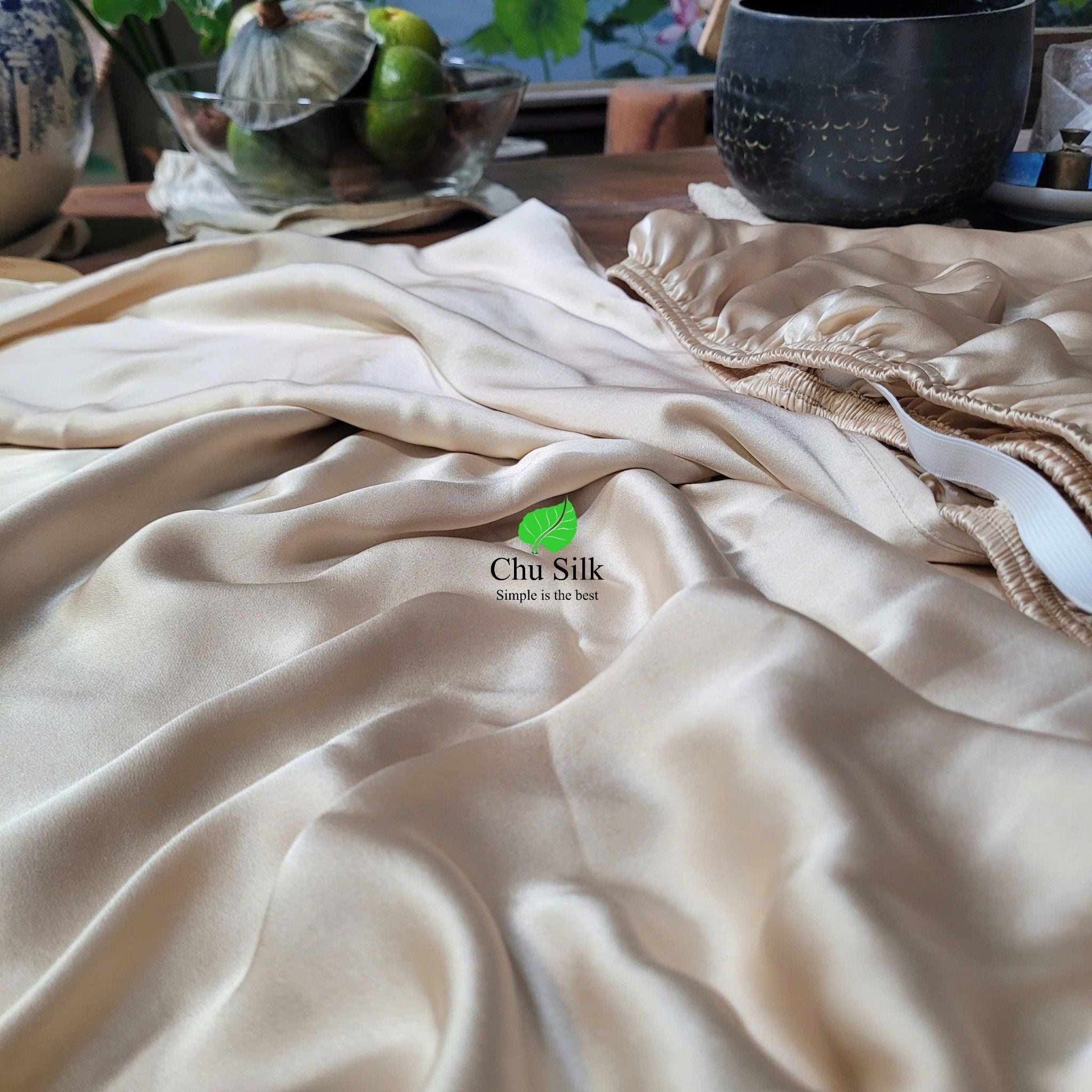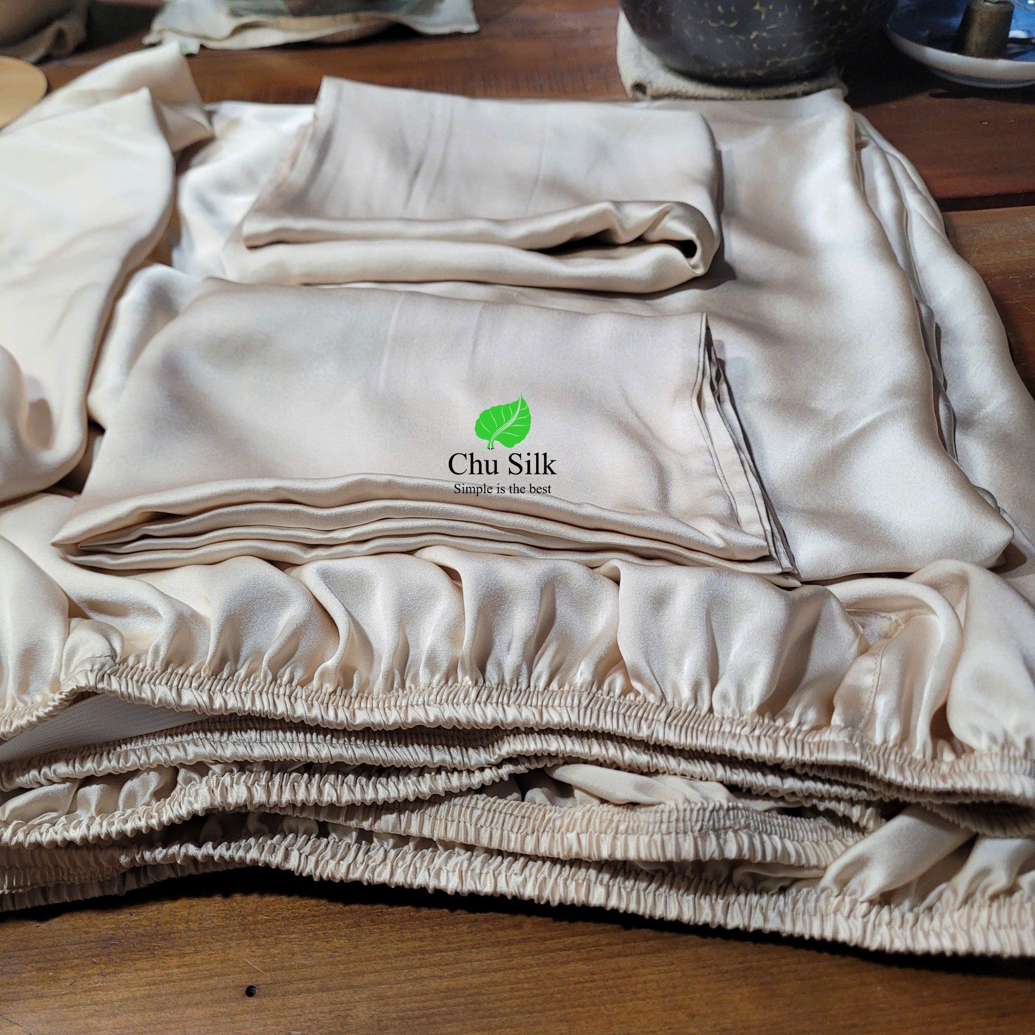 Set ga giường bo chun, vỏ gối lụa tơ tằm Chu Silk được sản xuất thuần túy tại Việt nam, từ khâu trồng dâu, nuôi tằm tới ươm tơ, dệt lụa và sản xuất ra những sản phẩm cuối cùng cao cấp.