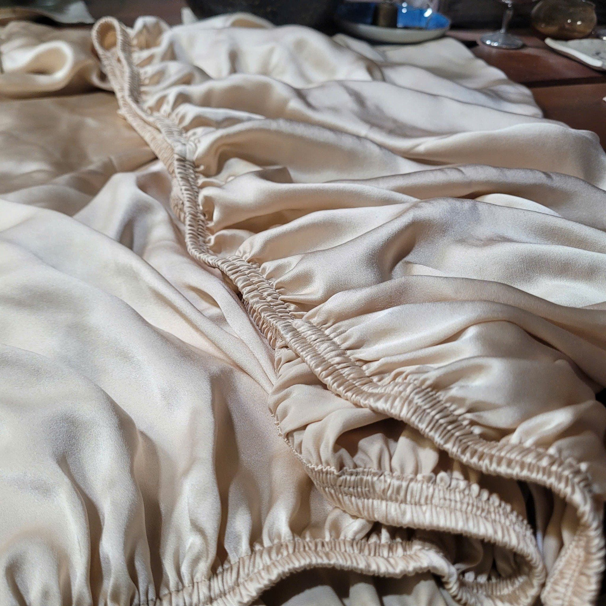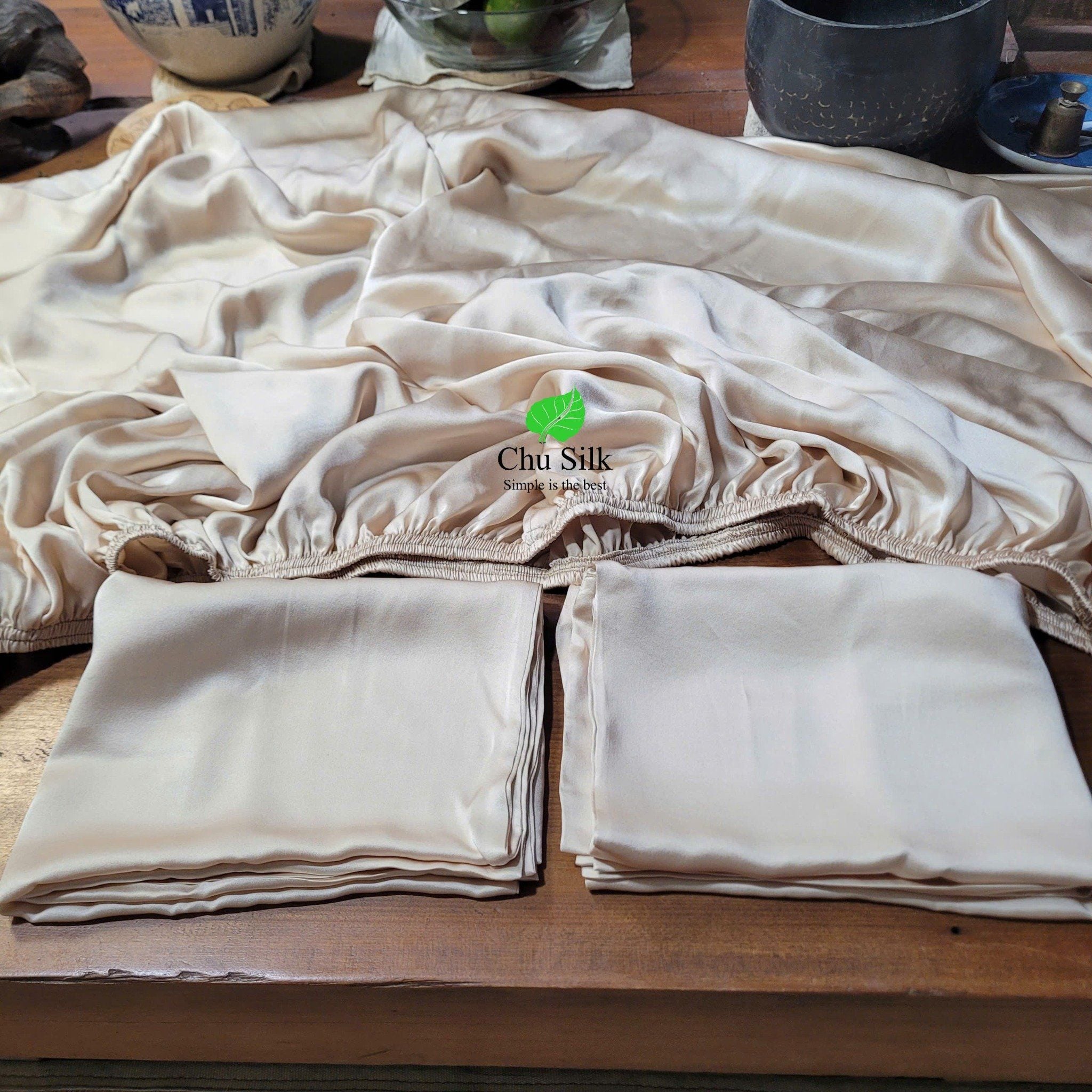 Set Ga giường bo chun + 2 vỏ gối tơ tằm màu be, dầy 19momme