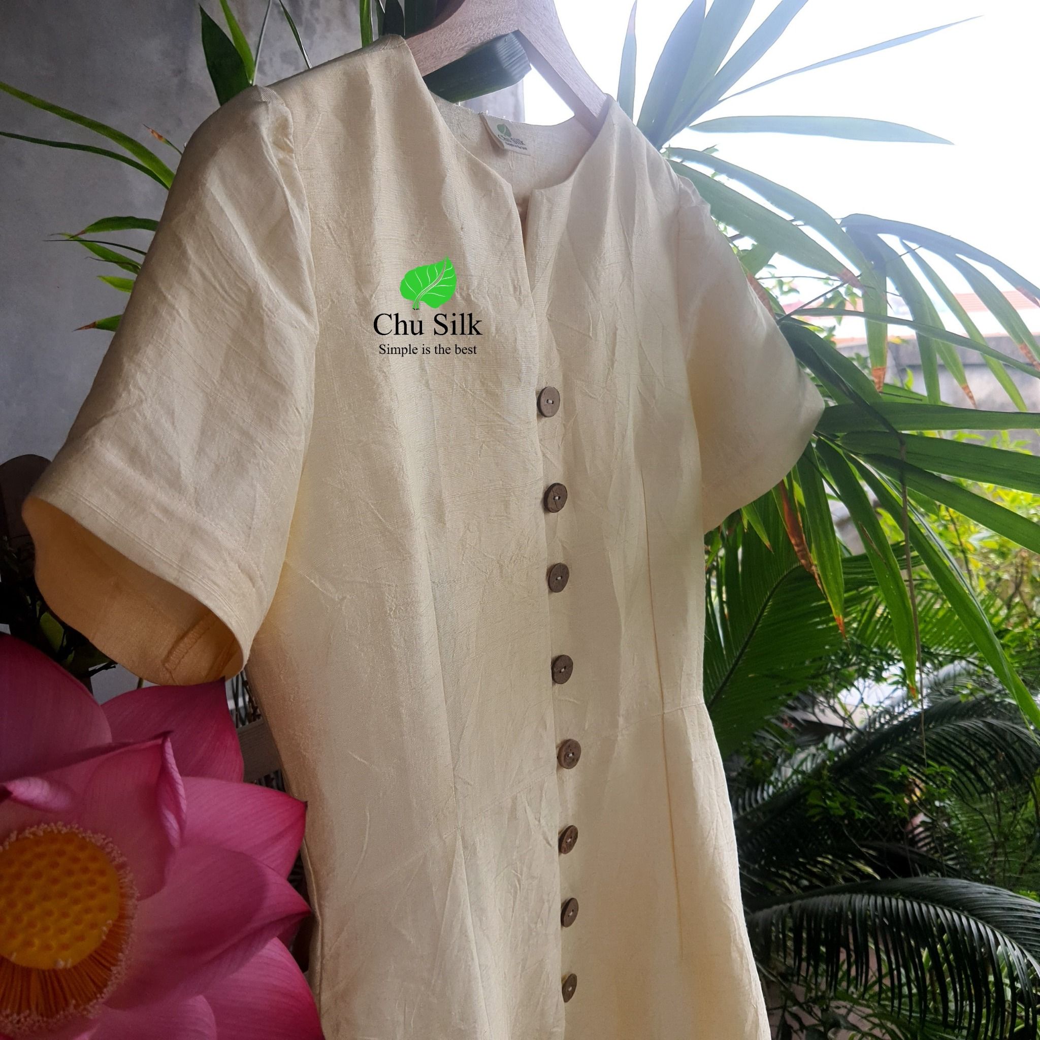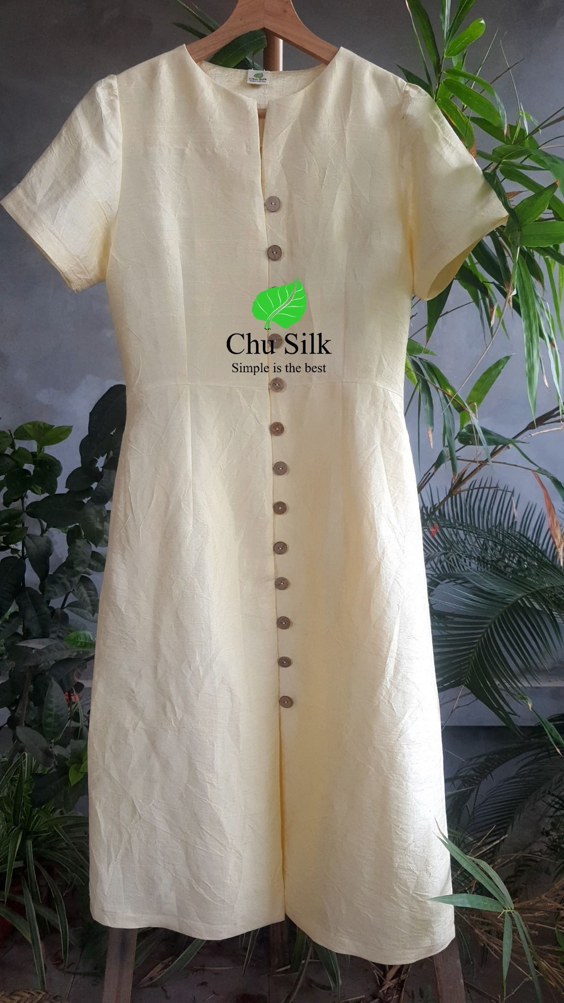 Váy tơ vàng nguyên bản có tay khuy gỗ